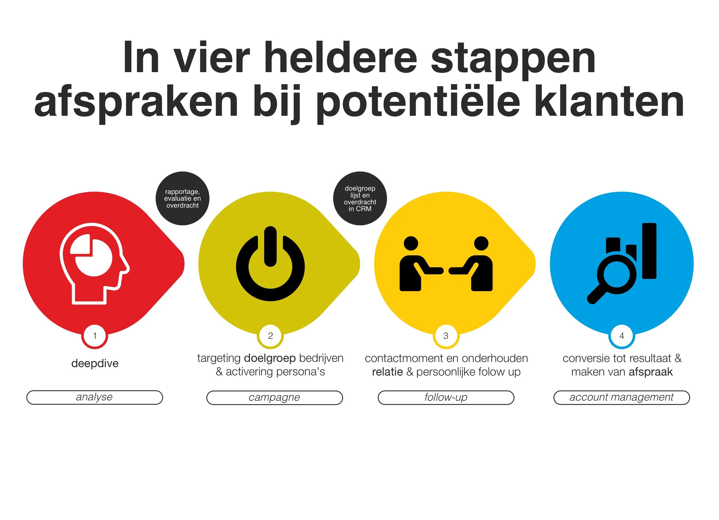 De innovatieve Prospect Funnel Methodiek zorgt voor een pro-actieve marktbenadering naar je doelgroep door research based-sales. Het levert nieuwe prospects op die worden afgeleverd in je CRM-systeem. Zo wordt opvolgen makkelijk wat het resultaat voor je organisatie verhoogd.
